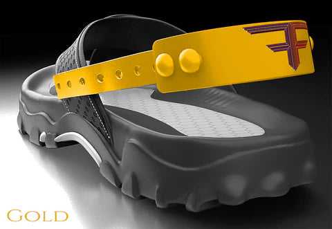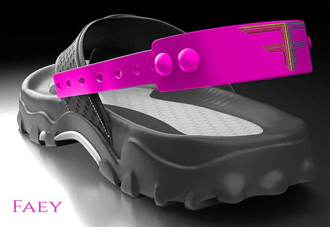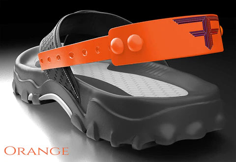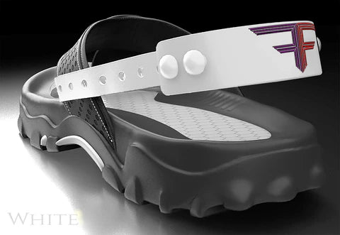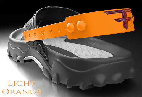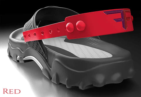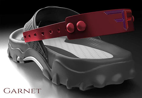 Medium sizing - the strap goes inside of the arms of the flip-flop and wraps back around toward the heel. This image shows the fasteners are moved over 2 holes. The right end wraps around the heel to attach on the left side and the left end attaches to the left side of the heel.